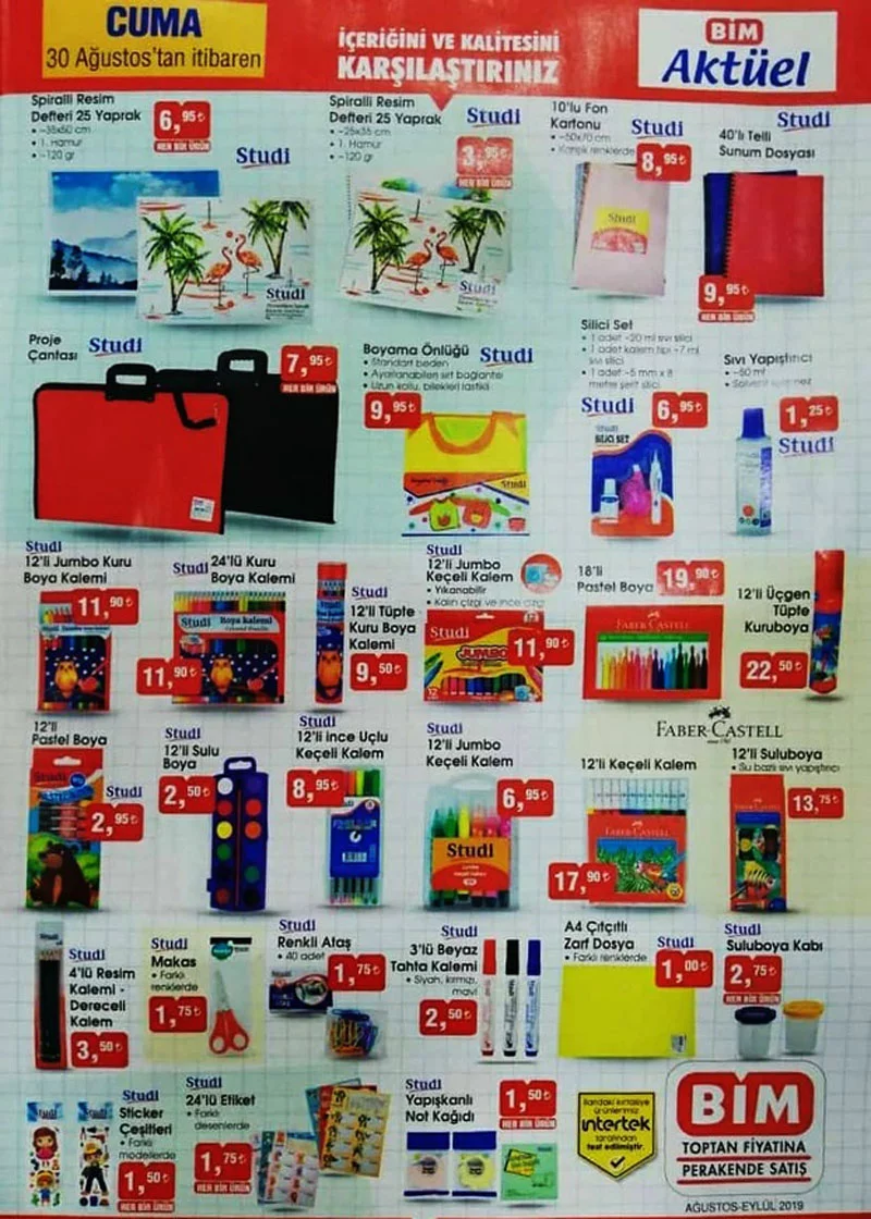 Bim aktüel 30 Ağustos kataloğu yeni hafta indirimlerinde kırtasiye ürünlerinde de çok özel fırsatlar yeni haftada sizlerle buluşuyor. Çok hesaplı fiyatlarla sizlere sunulan kırtasiye ürünlerine bolca çeşit Bim marketlerinde sizleri bekliyor. Detaylar ise şu şekilde: