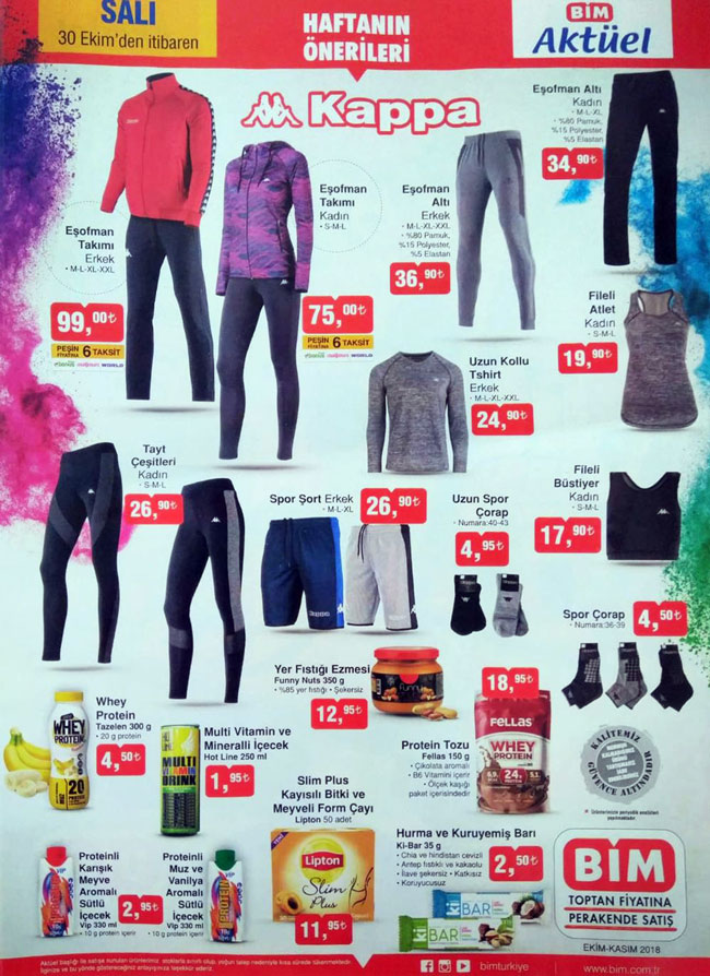 Bim 30 Ekim aktüel ürün kataloğunda yeni hafta indirimleri yine çok özel fırsatlar ile karşınızda. Bim 30 Ekim SALI indirimlerinde sporseverlere özel inanılmaz ürün ve indirimler Bim aktüel farkı ile sunulacak. Kappa markası ve kalitesi ile spor tekstil ürünlerinde süper fırsatların yer aldığı bu sayfada pek çok özel indirimi bulabileceksiniz. Detaylar ise şu şekilde: