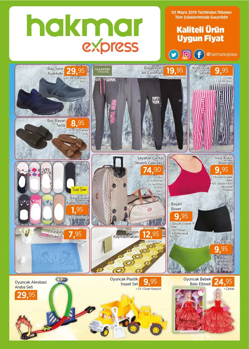 Hakmar 2 Mayıs aktüel ürünler kataloğu çok özel fırsatları ile sizleri şaşırtmaya devam ediyor. Tekstil ürünlerinde çok özel sürprizlerin sizlere sunulduğu bu sayfada ayakkabı ve terlik gibi ürünlerde sizlerin beğenisine sunuluyor. Oyuncak çeşitlerinde de çok özel sürprizler bu sayfada sizleri bekliyor. Detaylar şu şekilde: